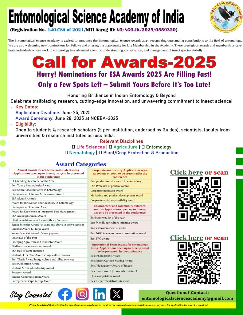 The Entomological Science Academy is excited to announce the Entomological Science Awards 2025, recognizing outstanding contributions to the field of entomology. We are also welcoming new nominations for Fellows and offering the opportunity for Life Membership in the academy. These prestigious awards and memberships celebrate individuals whose work in entomology has advanced scientific understanding, conservation, and management of insect species globally.